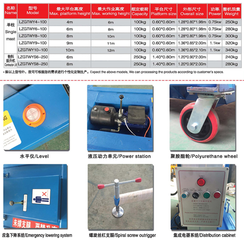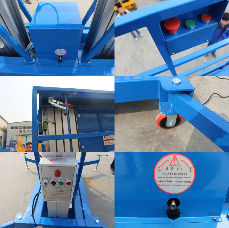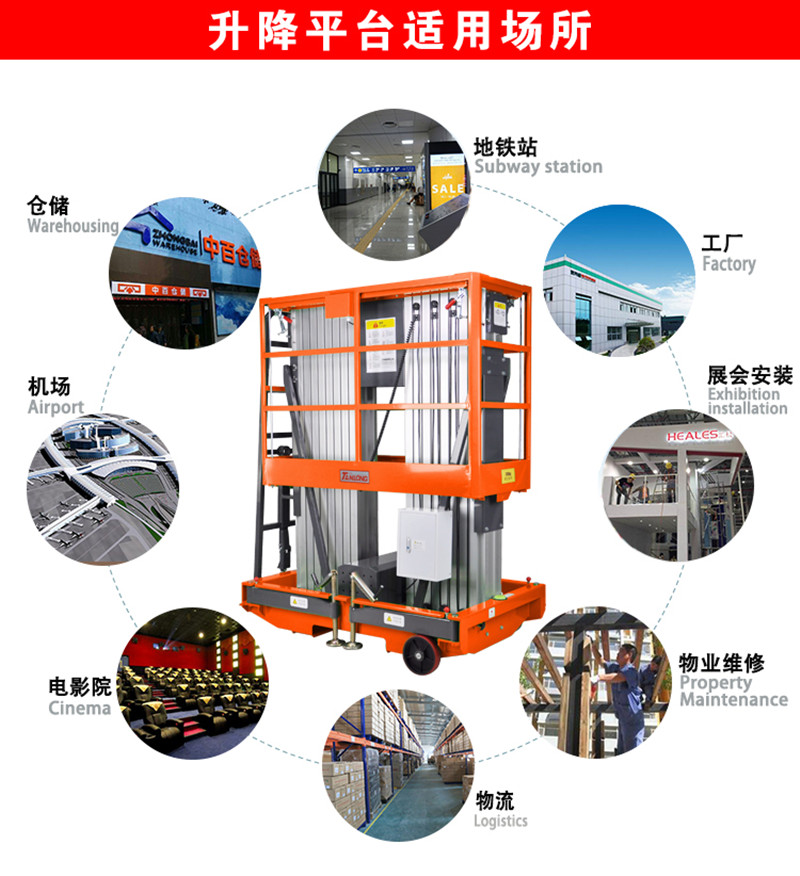 鋁合金式升降機該系列產品分為單桅柱,雙桅柱,三桅柱及四桅柱鋁合金升降平臺,升降桅柱選用優質高強度鋁合金型材,采用雙鏈條牽引,提高安全系數。鋁合金升降平臺廣泛適用于工廠、酒店、賓館、商場、超市、體育場、車站、電廠等,最適合狹小場地的高空作業維修,是保養機具、油漆裝修、調換燈具、電器、清潔保養等用途。